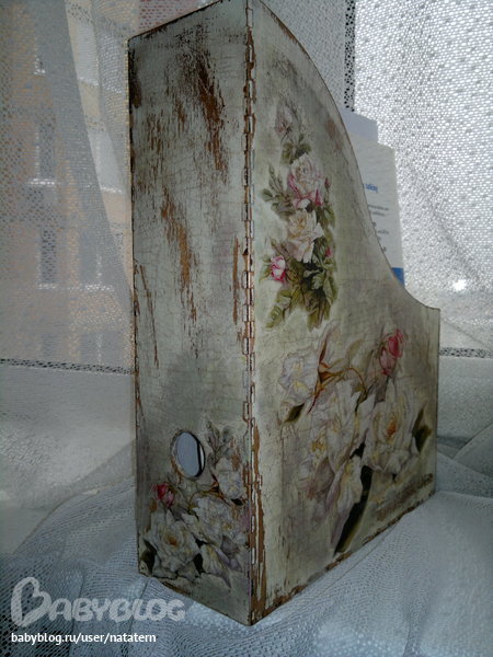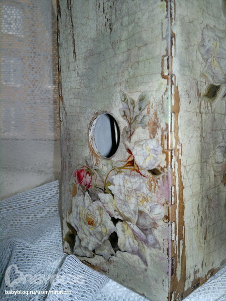ДекупажДолго думала что ж с ней сделать...вот, родилось...да в первый раз испортила кракелюрным лаком (по всей видимости устарел он уже)..пришлось все смывать ...драила усердно. В итоге смылось много базовой краски...покрывать снова краской не стала...Поэтому получилась такая сильная потертость.