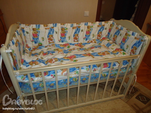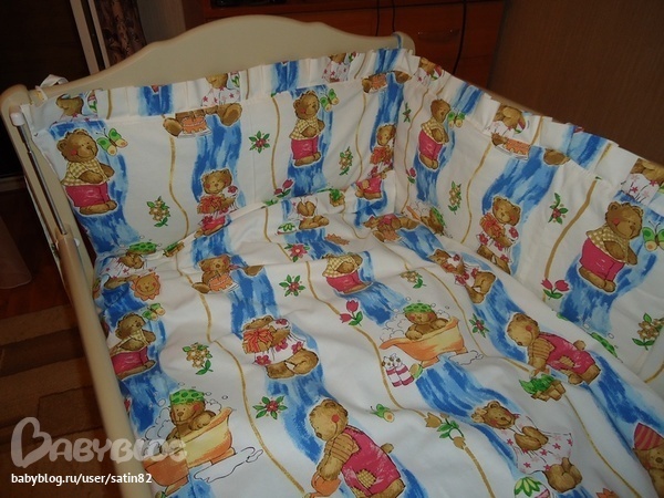 Я брала 8 метров, шила бортики и постельное белье (пододеяльник 145*115 и простынь 170*110), когда рассчитывала сколько ткани брать, не подумала, что на бортики надо будет рисунок подбирать, в итоге не хватило ткани на наволочку. Вот что получилось в итоге (передний бортик тоже есть, просто не прицепила пока его):