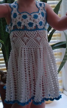 подол вяжется узором (похож на веер-в одной петле провязывается несколько столбиков) переход на талии вяжется узором по схеме (можно найти в инете) а верх вяжется из отдельных мотивов-цветков и привязывается к талии.