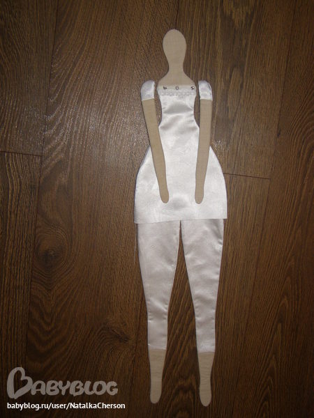 высота 64 см, длинная), ткань тела лен, а одежда- атлас с теснением (в реале цвет пряженого молока, не белый, и рисунок видно). хочу чтоб она нежная получилась.