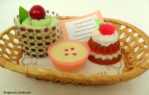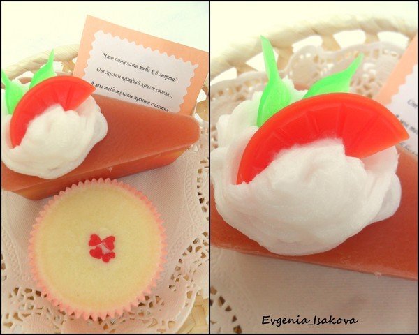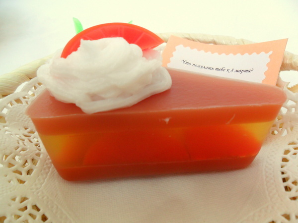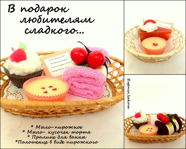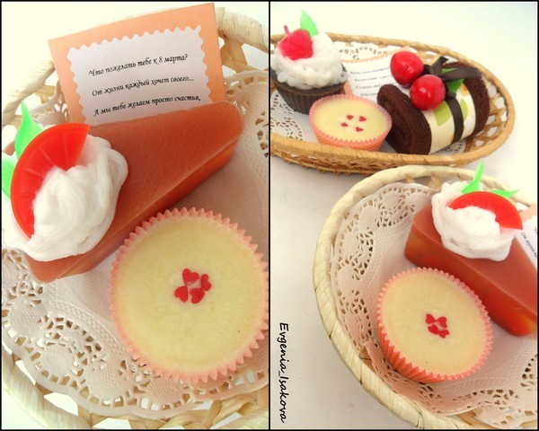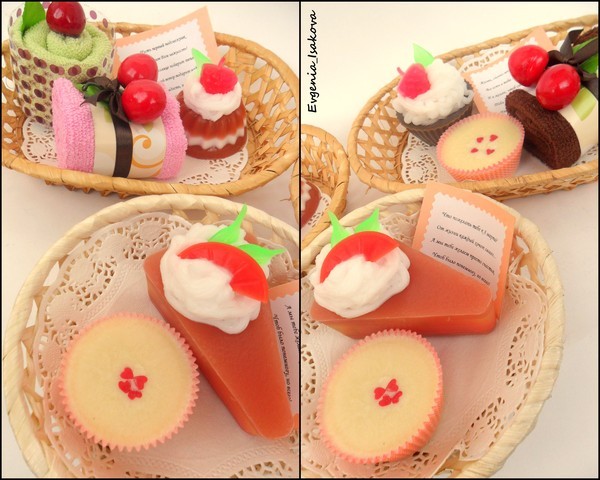 Всё мыло обогащено маслами виноградных косточек, маслом миндаля, персиковым маслом. Ароматы: пирожные с ароматом корицы, кусочек торта и пирожка полосатая - аромат Цитрус и гуава. Аромат клёвых, весь вечер ходила нюхала тортик:)))