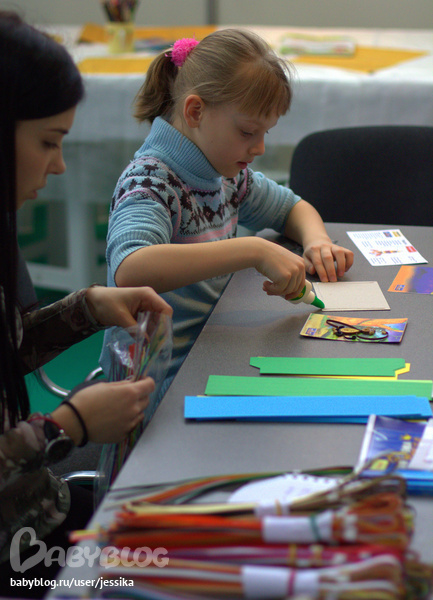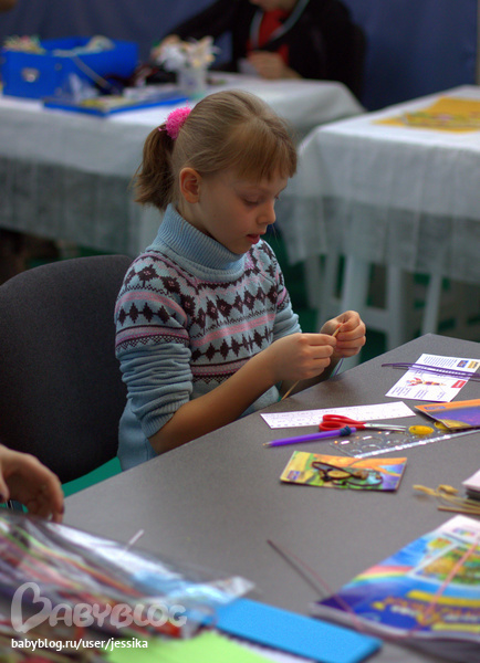 В первую очередь мы прошлись по всем МК, Аринку заинтересовал квиллинг. МК был абсолютно бесплатно и с Аринкой была ещё одна девочка и всё. Хочу отметить, что на этой выставке вообще много внимания уделили квиллингу. А вот вышивки стало меньше...