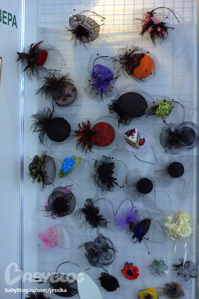 Стенд с красивыми шляпками и цветами из ткани. Специально для