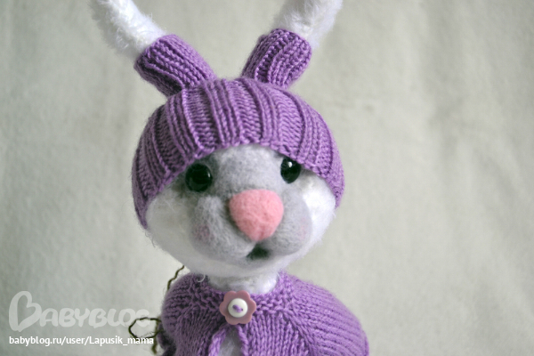 Связана из травки Лотос Стрейч, шерсть, гранулят, лапки и голова на шплинтах, уши армированы. Рост 21 см без ушей.