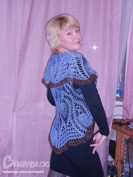 пряжи название не помню,т.к. она у меня лежала аж 5 лет без впроку,с люрексом. знаю что в мотке 300 метров,3 мотка ушло