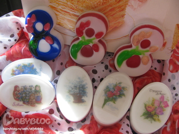 Женя, спасибо ))) твоя оценка для меня оооочень ценна )))) ты для меня профи!!! Намучилась я капитально пока разобралась как и что. Картинки для водорастворимки еле нашла где напечатать. Принес мне муж (я его просила съездить распечатать) этот листочек с картинками и я ужаснулась. Они такие темные, краски не поймешь какие. Но думаю попробую. И все такие они какие-то тусклые у меня. Одно испортила. Провела сверху пальцем по нему, когда уже из формы вынула и след от пальца сразу стал виден и оно как-бы помутнело. У тебя они яркие. А щас вот голову ломаю за сколько их продать, т.к. они все на заказ сделаны. В магазине щас простенькое одноцветное ручной работы просто квадратное стоит 220р. У меня за такие деньки никто и брать не будет. Как думаешь 80-100р. нормальная цена?