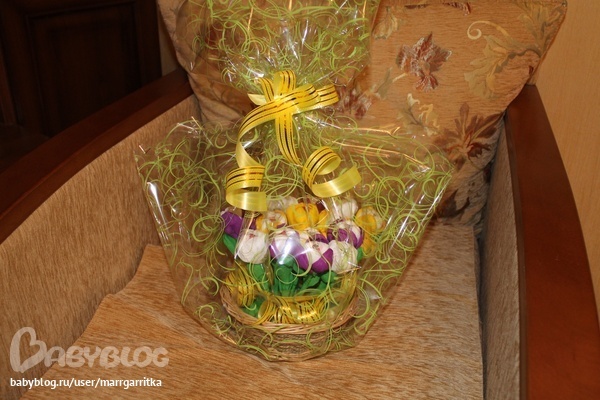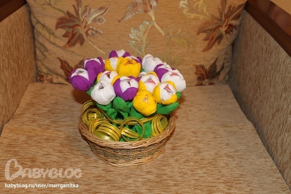 Спасибо, Валюш! Ты знаешь нет, но по времени довольно долго крутила их, достаточно кропотливо все это. У меня в этом букете было 17 цветков, по времени часа 3,5 сидела. Но это дело опыта наверное и сноровки. А вообще хочу купить настоящую гофробумагу для флористов, она плотнее и цветы из нее лучше форму держат. Вообще хочу еще клеевой пистолет, тут я просто двойным скотчем пользовалась.