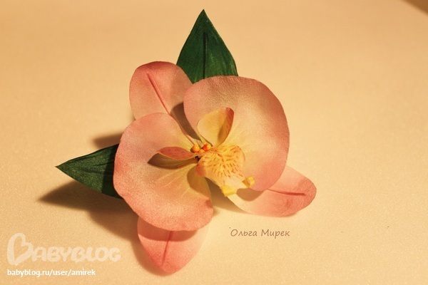 Вот она, моя первая орхидеюшка! Вообще-то я к орхидеям всегда была хладнокровна, но после того, как сама сделала такую красавицу из шелка, просто влюбилась в этот цветочек! Теперь поставила себе задание штучек 5 орхидей сделать разных цветов в качестве заколочек!)))
