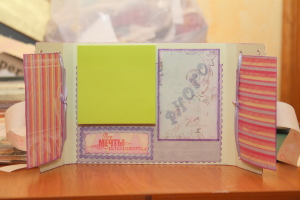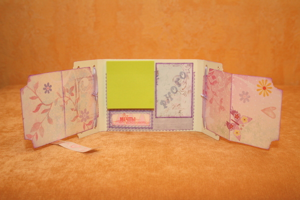СкрапбукингЗабавный красочный блокнотик получился у меня сегодня. Внутри открываются две створки, куда можно приклеить малюсенькие фото, какой-то памятный билетик или что-то иное памятное, а можно ничего не приклеивать и будет просто напоминание о теплом лете и воздушных бабочках. Рядом с блоком для записей место под фото, а когда блок закончится - на его место можно поместить другой