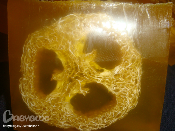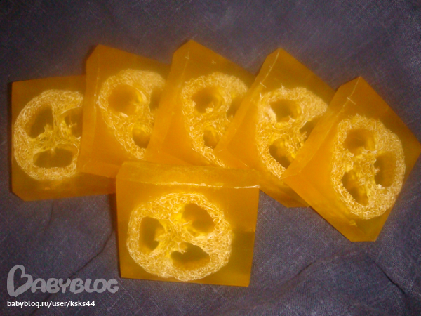 Медовое с люфой, обогащено маслом зародышей пшеницы и облепиховым маслом (для цвета), естественно, мед! Пахнет медом (ароматизатор).