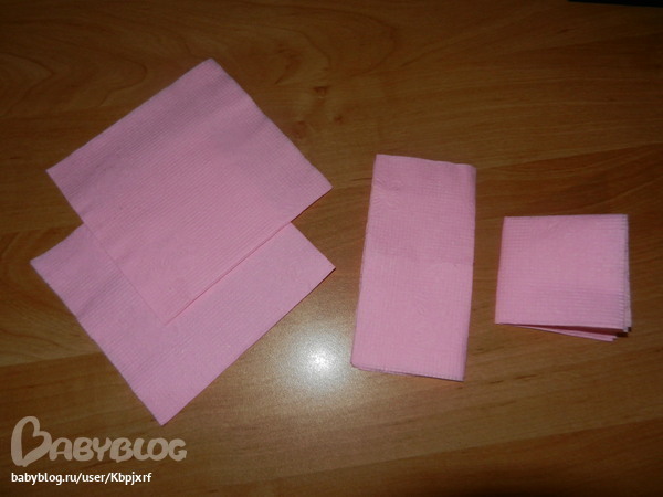 1) берём две салфетки,каждую сворачиваем пополам, затем ещё пополам, чтобы получился квадрат.