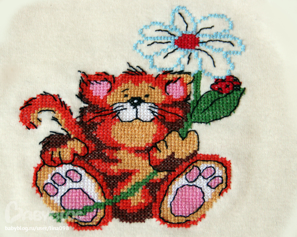 классный котик!! у меня живет точно такой же )))) правда в рамочке и на стенке. А вы молодец что на одежку вышили, вдвойне красиво будет!!!! ))))