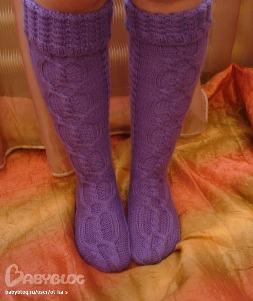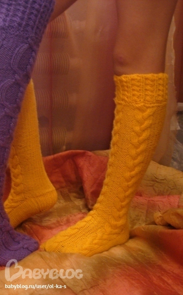 Она сказала,что сиреневые вязала по схеме http://nitochka09.ru/blog/43896713678/Golfyi-v-kosichkah ,а желтые она уже сама высчитывала петли и узор любые косы.