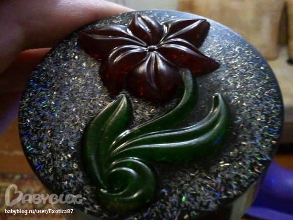 эксперимент с заливкой (касторовое масло+глиттер+отдушка орхидея и ваниль) на фото не очень видно, т.к. черный фон, но цветок ярко-красный и стебель с листиками ярко-зеленые