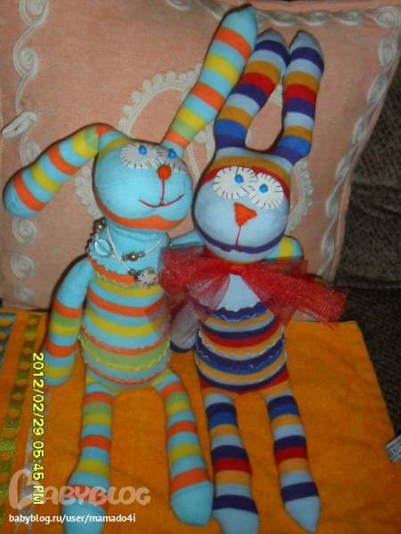 Игрушечный мир - животныепошила из носков вот таких девченок-зайчат.на одной немного похулиганила и сделала ей попу.