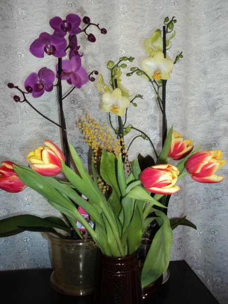А цветы.....мои любимые орхидеи...., жаль стоят они сейчас, как чугунный мост, подняли цены на восьмое марта с 400 - до 1500 рублей, совсем офигели...муж хотел приложить к основному подарку, но за такие деньги ну нафик...потом без праздников купятся...полюбуюсь твоими