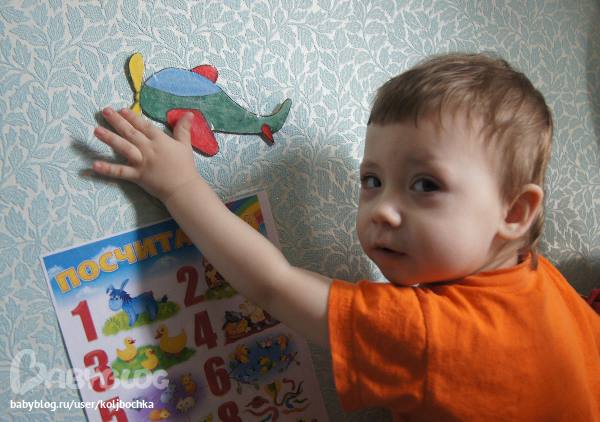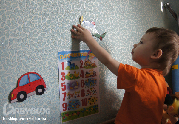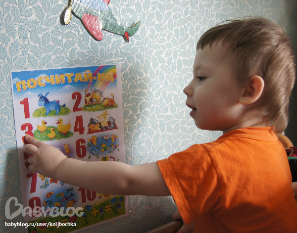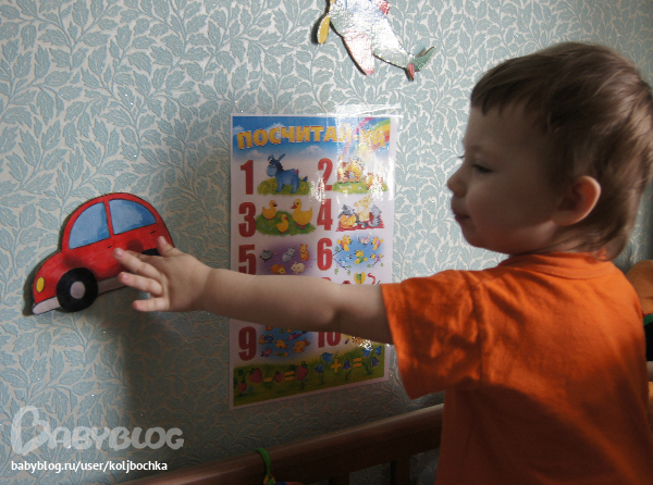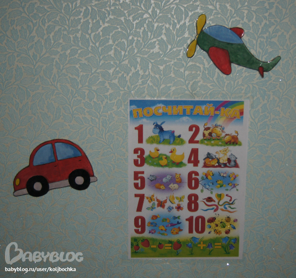 Плакат с цифрами нашла в инете и распечатала,скотчем лицевую сторону оклеила и приклеила скотчем.Считаем картинки раза 2-3 в день.