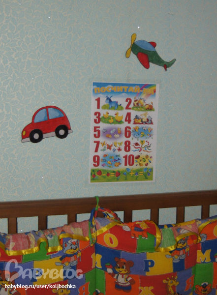 Макс любит машинки и самолётики.Давно у меня была идея сделать ему над кроваткой наклейки из техники.Нарисовала,сверху скотчем оклеила и на картонку приклеила.На стене на двустороннем скотче держится.Ниже фото.