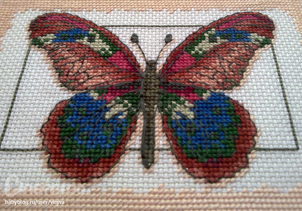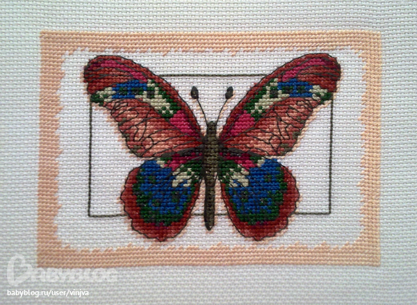 Дизайн от Dimensions "Butterfly And Leaves" (65026), перенабор в РМ, но ниточки из запасов и в оригинале Aida 14 ct цвета слоновой кости.