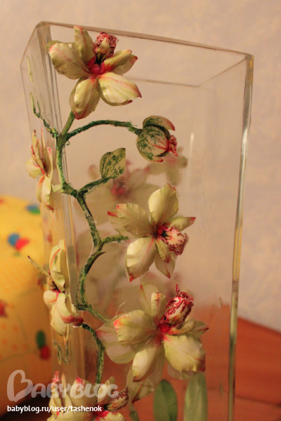 эта техника объемного декупажа - Sospeso Trasparente. Декупажная карта (или салфетка) наклеивается на специальную пленку и специальными бульками моделируется форма цветка. Если интересно зайдите в мой дневник,в самом начале я выкладывала несколько своих работ в этой технике.