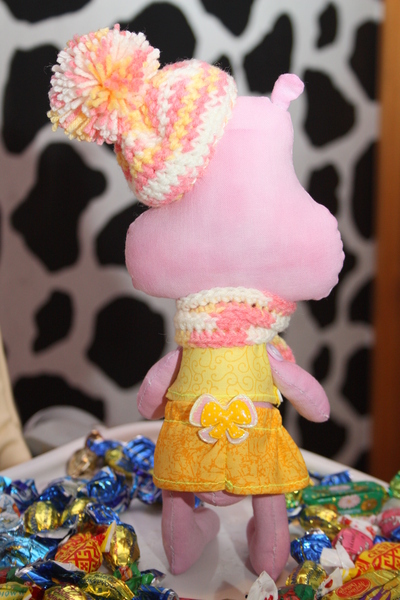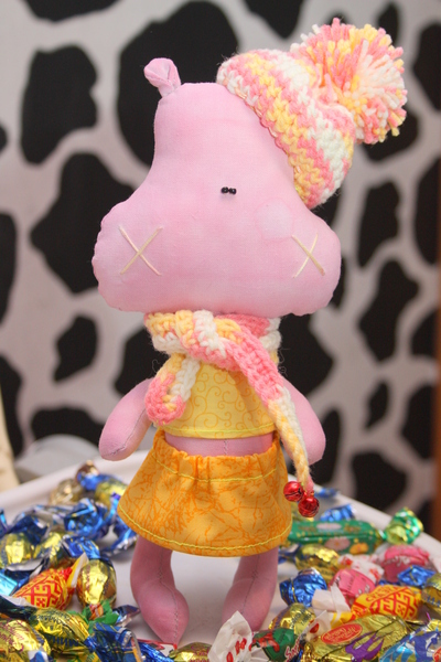 Игрушечный мир - животныеМоня изначально задумывалась мальчиком и из белой ткани, но в процессе не лежала у меня душа и не смотрелся белый цвет. К трем часам ночи я уверилась в этом чувстве и пошла на кухню искать что есть для покраски ткани - нашлись пакетики чая каркаде, заваркой которых и была покрашена ткань. Так вот бегемотик превратился в девочку с милым именем Моня