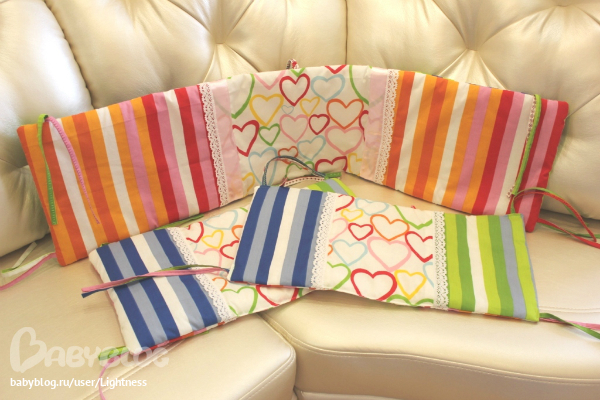 Бортики из 3 частей: 2 коротких (в ноги и голову), одна длинная, набиты синтепоном разной толщины (для головы потолще). Высота - 30 см, т.е. они не будут закрывать всю решетку кровати, а только низ.