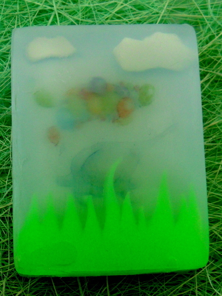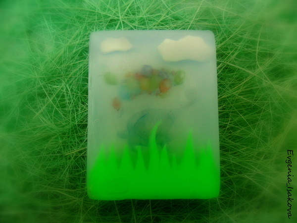 Вот, надеюсь удастся что-то разглядеть:) На фото не видно,облака кажутся объёмными, тк заливала в несколько слоёв. Облачка и травка вырезана, слоник на водорасторимой бумаге. Обогащено маслом персика, аромат Огурец (свежо, по-весеннему:)
