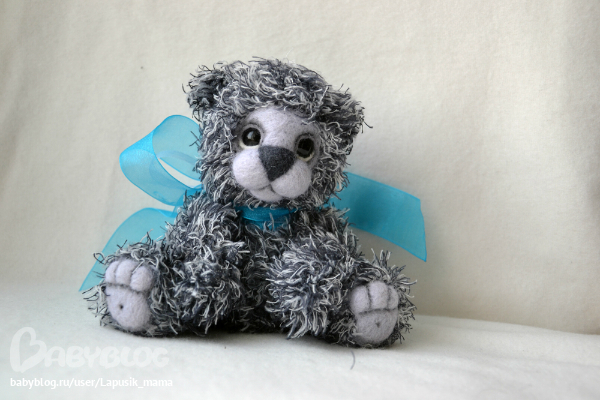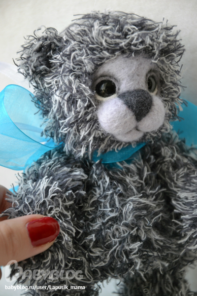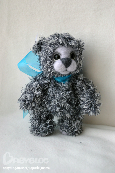 Связан из фактурной пряжи, мордаха и пяточки из шерсти, в попке гранулят, лапки и голова на шплинтах. Рост 16 см.