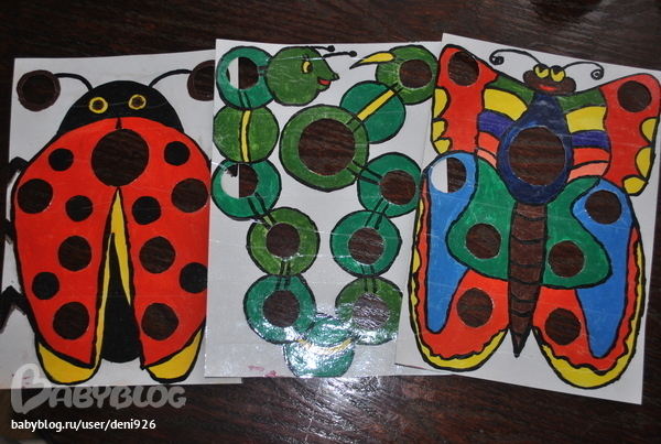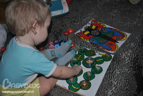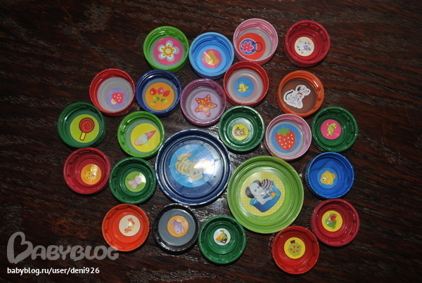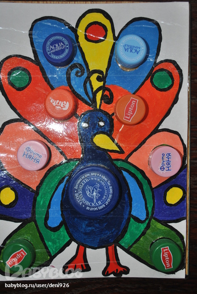 Спасибо!!!  Идея девочки Наденьки, указала в посте, (спасибо за подсказку). А вот идея замечательной бабушки Вовика. Сделал нам наш любимый папочка + мамочка новую самодельную развивашку "Павлин"  (и не только) с пробками. За идею огромное спасибо Елене.  Этой замечательной женщине с золотыми руками. Доченьке очень понравилось, особенно почему-то гусеничка, а мне павлин!!!       Вот еще божья коровка, гусеница и бабочка (больше не осилила).Картинки нарисовала, раскрасила гуашью и обклеила скотчем. Я их потом все одеваю на доску.      Это основа, папина заслуга, спасибо его умелым рукам.       Пробочки. Мы с Дианой на каждую пробочку приклеили наклейки, "касота".Под большую пробочку можно прятать мелкие игрушки, например от киндер-сюрпризов.     Что интересно, Диана пару раз открутила, искала кто же там под пробочкой, а потом сначала говорит, что там "каб" и  откручивает, и правда. Я не запомнила, а она знает. Я удивилась!     Гусеничка больше всего понравилась!      Я люблю, что бы было все красиво и сложила я пробочки в красивый новогодний, сиреневый мешочек. А Дианочка побежала за своим  новогодним дракончиком и стала туда складывать пробочки, мы с мужем обалдели. Спасибо за идею Диане.Дракончик сзади на молнии, вот и еще одна тренировка пальчиков.     Вот так выглядит наш дракончик с пробками. Ну вот и все, как вам?!