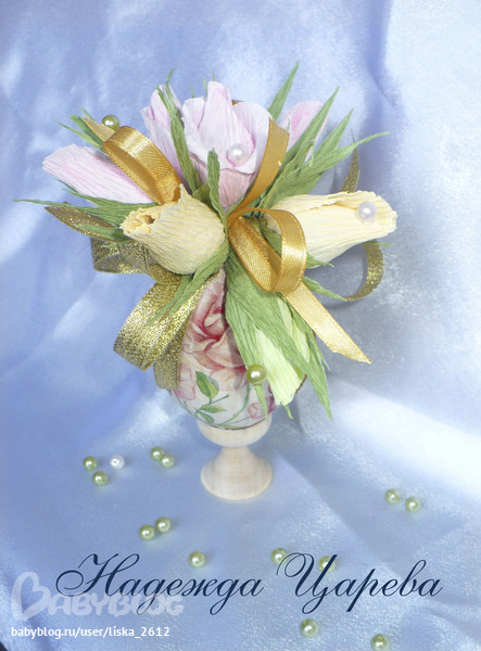 так то все смотрится хорошо, а яйца не видно... а если бутоны опустить к основанию( на ножку) и цветы и яйцо было бы видно, и понятно