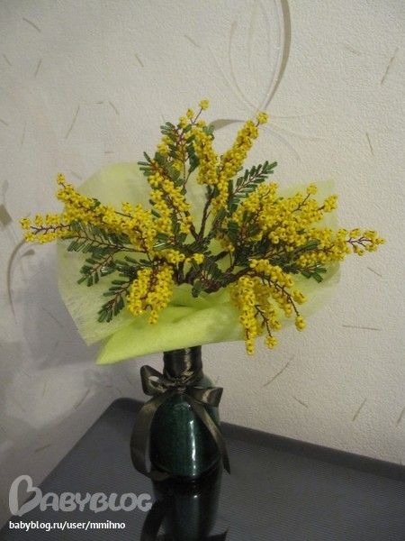 Леночка, спасибо! Поближе есть бутылочка, но тебе же интересны цветочки))) Жалко на фотке цвета другие, в реале мимозка такаяже, а вот декоратвные элементы ярче. Но уже не перефоткаешь, букетик уехал )))