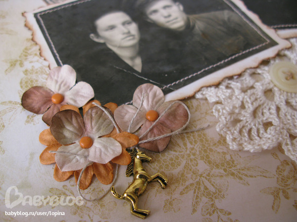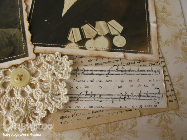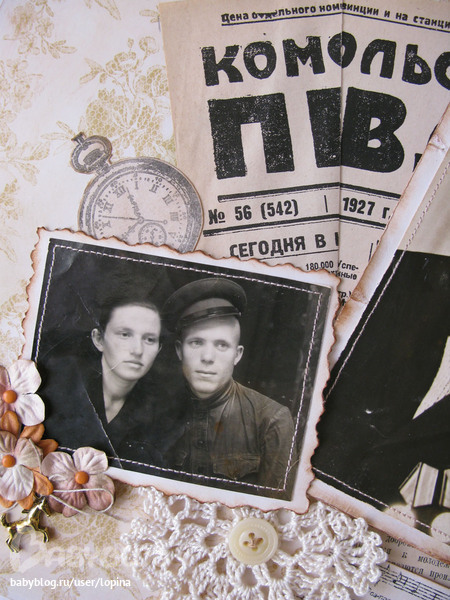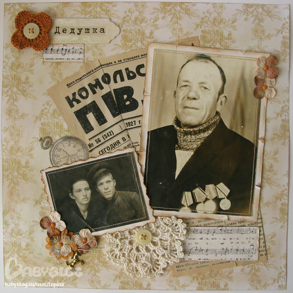 Сашина мама. Это она уговорила меня сделать страничку в память о ее любимом дедушке. Первая моя работа на заказ. Я очень-очень волновалась, специалистом в скрапе себя совсем не считаю. Многому учусь по ходу выполнения работ. Читаю Скрап-инфо. Очень помогло мне приложение к журналу на тему "Композиция в скрапбукинге". А еще выучила некоторые техники и попробовала жидкие дистресс чернила. Вообще, очень интересно было работать над страничкой. Изучала много информации о далеких годах, пересмотрела много старых газет и фотографий, узнала историю жизни незнакомых мне людей. А вот и сама страничка: