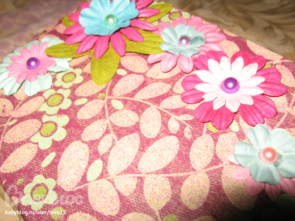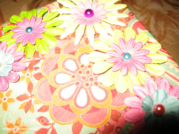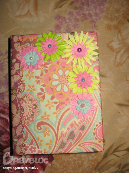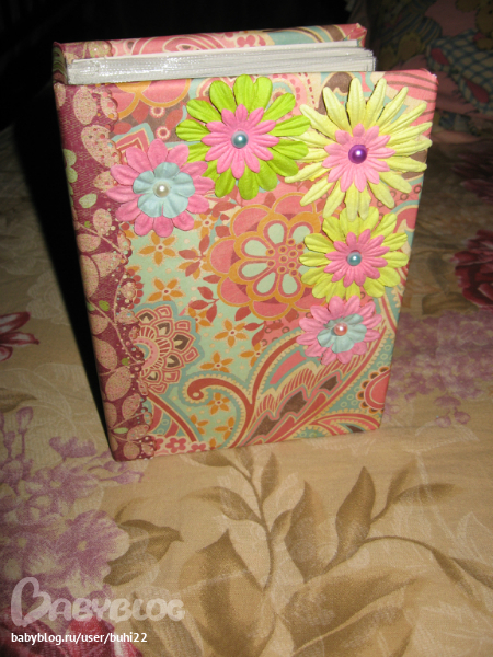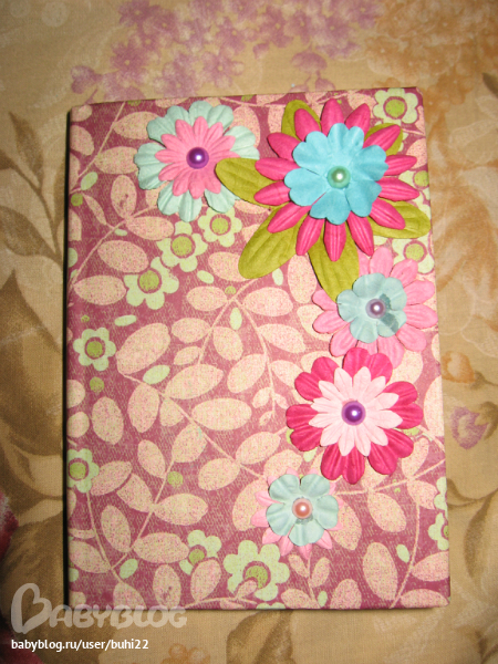 СкрапбукингВечером 7 марта муж сказал мне что его сестра очень хочет в подарок фотоальбом. Что же делать? За ночь я бы не успела ничего. Сбегала в магазин за обычным альбомом для фото и начала над ним колдовать. Так же сделала зап.книжку для своей мамули, ведь она так хотела чтоб у нее была своя зап.книжка, куда можно записывать все что так для нее важно. Вот что вышло: