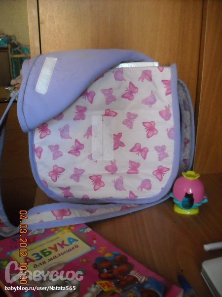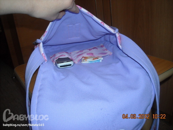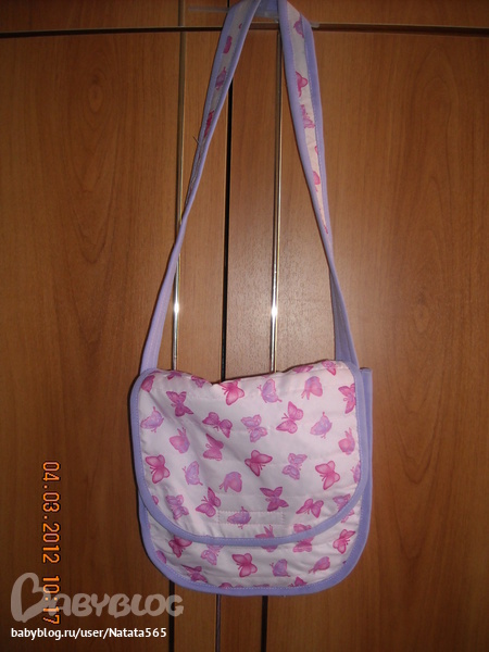 Сумка сшита из плащевки, которую я простегала с тоненьким синтепоном. Подкладом нам послужил......габардин!!! Внутри сумочки есть 2 кармана: для мобильника(пока игрушечного), и для платочка(например). Размер сумки 25Х23, и глубина 6 см. Застежка на липучку. Сумка достаточно вместительная, не промокает (прошла испытание под мокрым снегом), и легко стирается, при этом не теряя первоначального вида. Вот такая сумочка у нас получилась!