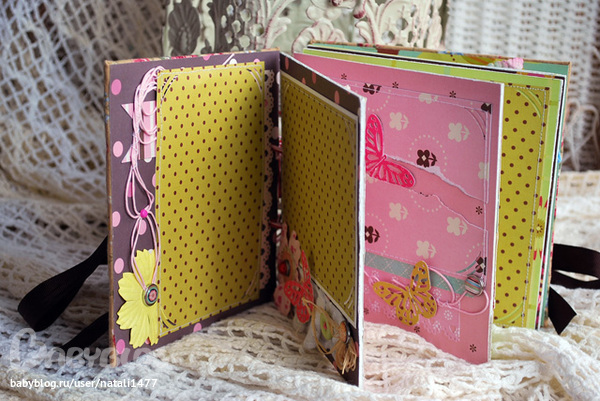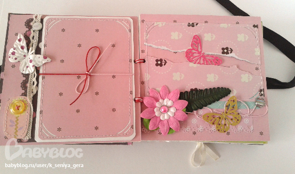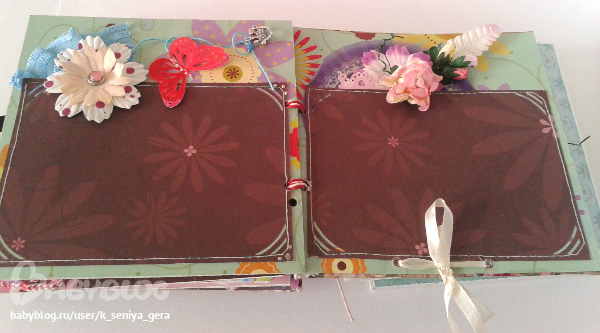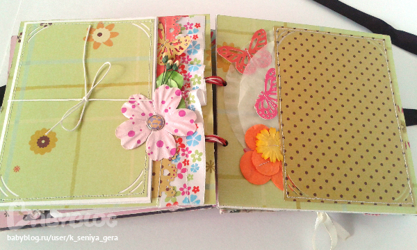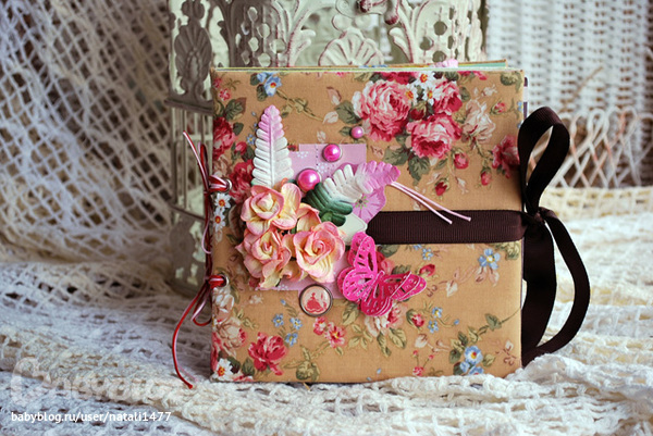 Ну как же приятно!!! Красивый альбомчик получился, а главное не пестрый. Ленточка явно не черная, но смотрится темновато. А еще, мне кажется, на некоторых страничках цветы для такого размера крупноваты.