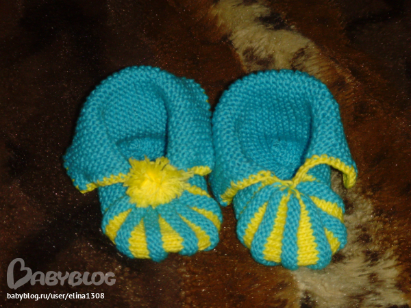 Молодчинка, мне с помпоном тоже очень нравится, а можно продеть шнурочек,вязаный из воздушных петель крючком по краешку и на концах сделать два помпончика и завязывать. Маленькие детки активно работают ножками поэтому всегда пинетки с завязками нужны.