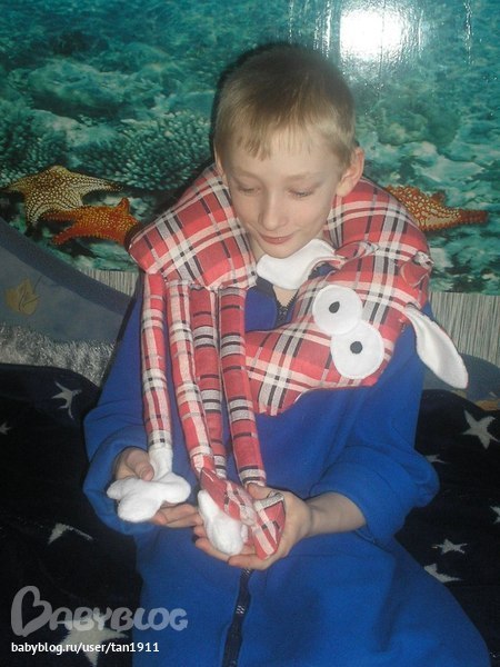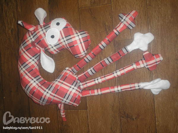 но выкройку с А3 листа я еще увеличивала . от ног до носа по кругу он получился сантиметров 65-70. Сшит он из обычной фланельки. А наполнитель-синтепон.