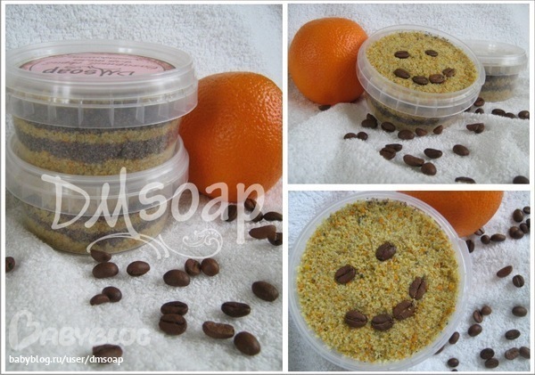 Состав: соль морская мелкого помола, молотая цедра апельсина, свежемолотый кофе, масло антицеллюлитное, масло миндаля, масло облепихи, витамин Е, эфирное масло апельсина.