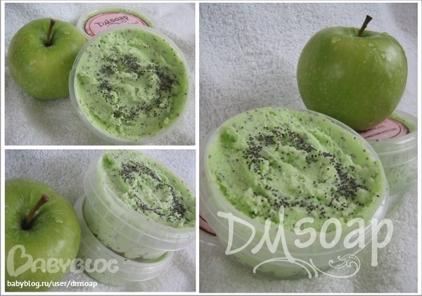 Состав: кремообразная мыльная основа, масло оливы Extra Virgin, масло како, масло виноградных косточек, масло миндаля, витамин Е, мак кондитерский, отдушка "зеленое яблоко".