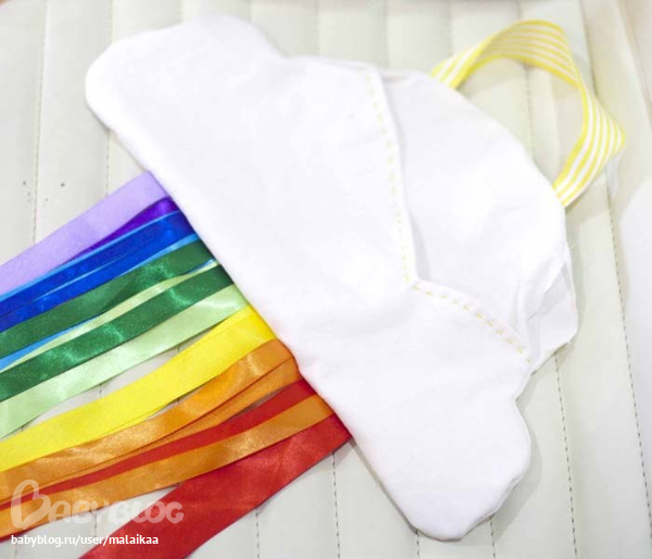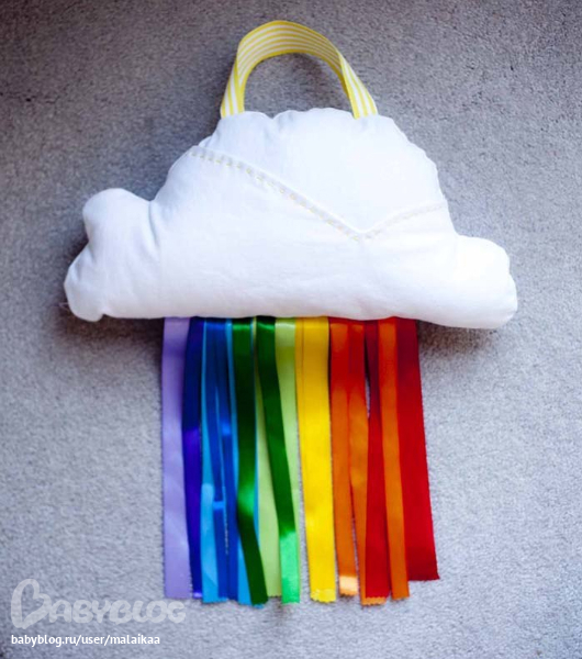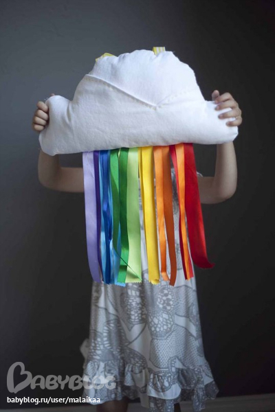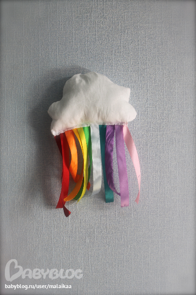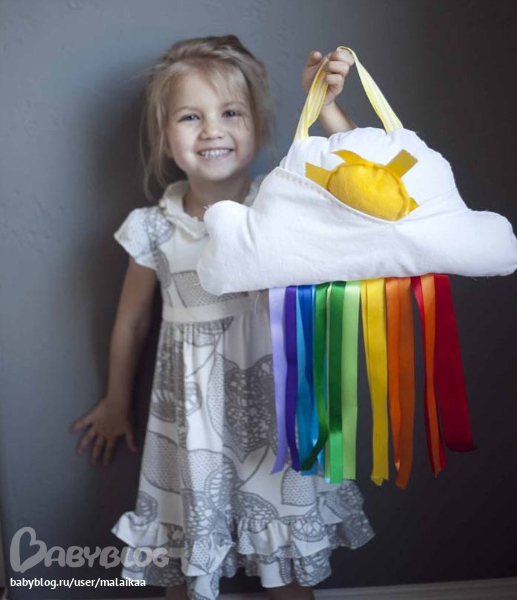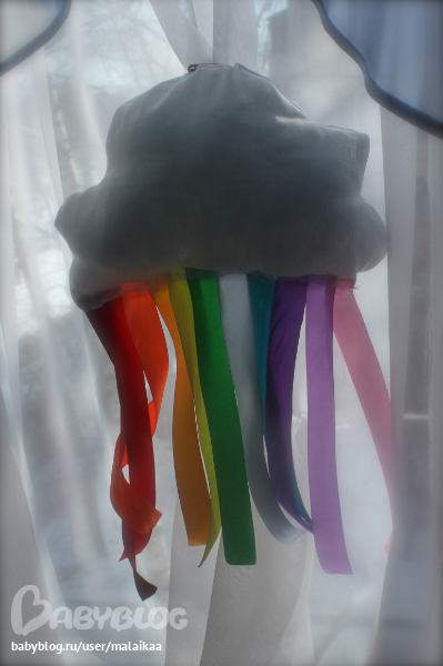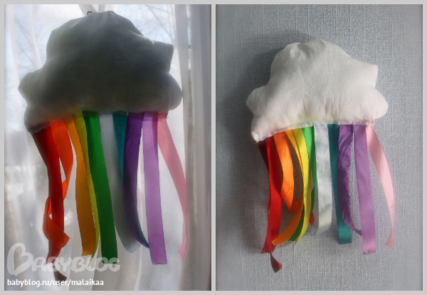 Я буду делать так: с одной стороны она будет белая ( как чистое облачко в хорошую погоду), с другой серая ( грозовая тучка). Кармашек для солнышка - сделаю обязательно. А вот радугу сделаю так же только отдельно (на липучке или крючечках - пока не решила))) и таким же образом еще : снежинки, капельки, молнию. Липучка (или крючечки будут двусторонние). Вообщем для ребеночка это может быть своеобразный календарик например : сегодня светлое облачко и снежок, или серая тучка и дождик а может и молнияяяя!!! - а потом светлое облачко и радуга) Повесить можно рядом с окошком на крючечек и и менять "погоду" !!! ну не знаю я так себе придумала. Мне как раз сейчас предстоит сделать подарок для малыша, долго искала идею и вот нашла, будем воплощать))))))))))))) по сути там можно "развивать и развивать" сами "детали" - снежинки, капельки итд - из материалов разных по фактуре, или например радуга на молнию пристегивается, снежинки на кнопочках, капельки на липучке, а молния на пуговке...