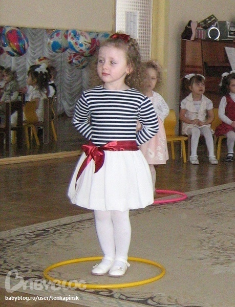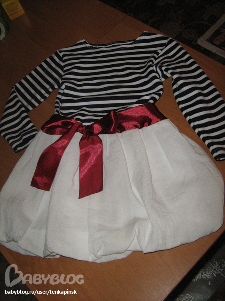 Обожаю морскую тему, в этом сезоне она особенно актуальна. Кстати, платье сшито из мужской тельняшки и небольшого отреза белого цвета для юбки-балон, пояс - атласная лента.