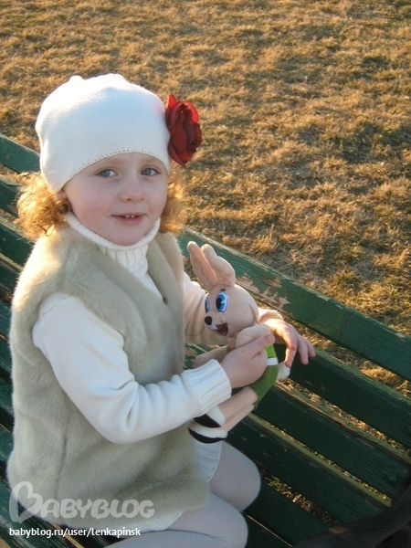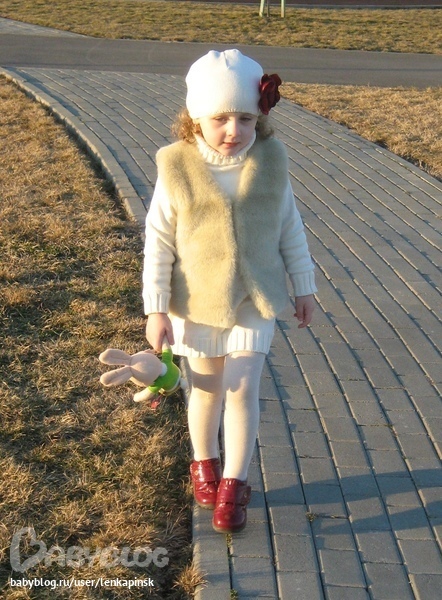Следующий наряд сшит после похода по детским магазинам. Очень понравилась меховая жилеточка. Но рука не поднялась отдать за неё 40$. Купила в ближайшем магазине тканей кусок меха за 10$, и получилось ничуть не хуже оригинала, еще и практически половина меха осталось. Сошью к ней несколько поясков на выбор под разные наряды - и тепло и красиво. Кстати, очень люблю шить из меха, не видно никаких неровных строчек и изъянов )))))).