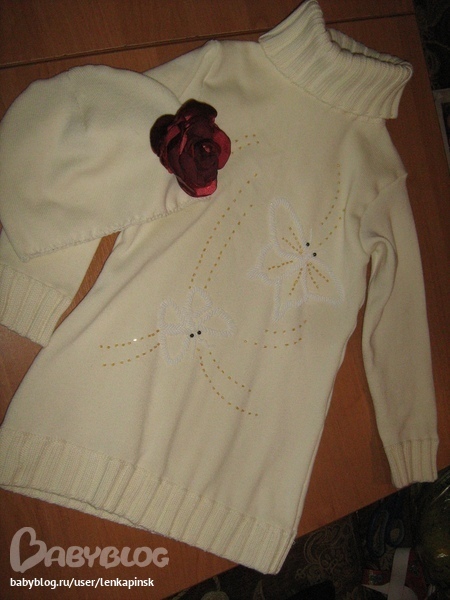 Перебирая шкаф, обнаружила свой свитер, купленный лет 10 назад и одетый максимум 3 раза. В нем мне нравился только цвет. Решила сшить из него шапочку Маше. Прикинув, поняла, что из остатков от шапочки вполне выйдет платье (именно так, а не наоборот