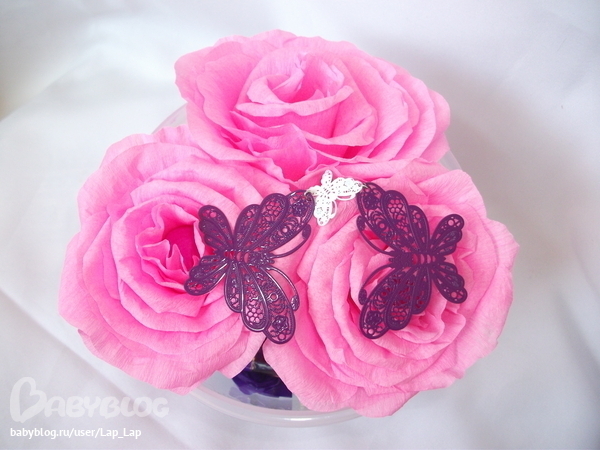 Спасибо! Каюсь розочки пока без стебелька, нет зеленой бумаги(( Сейчас они на таком этапе...А бабочки это бывшие сережки они из тонкого металла...