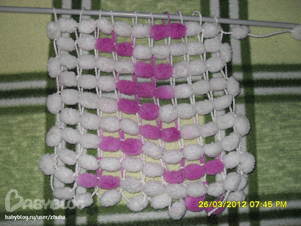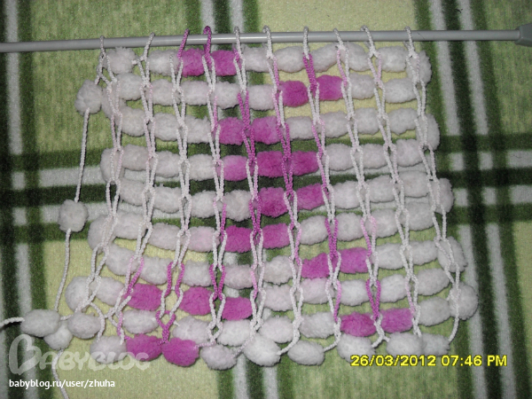 что б Ваш шарфик был плотнее, надо провязывать не одну петлю , а две,,,,между бумбошками,,,,,,удачных петелек!