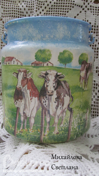 сначала шкурила,затем грунтовала,потом покрыла белой акриловой краской...наклеила салфетку и стала подрисовывать...ну и пото несколько слое акрилового лака с промеуточным шкурением и финишный лак...и всё..бидончик готов)))) удачи вам))