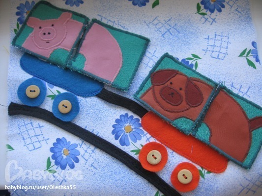 Паравозик и вагончики. животные сделаны в виде пазл на липучках, колеса тоже отстегиваются.