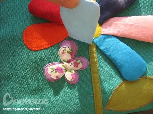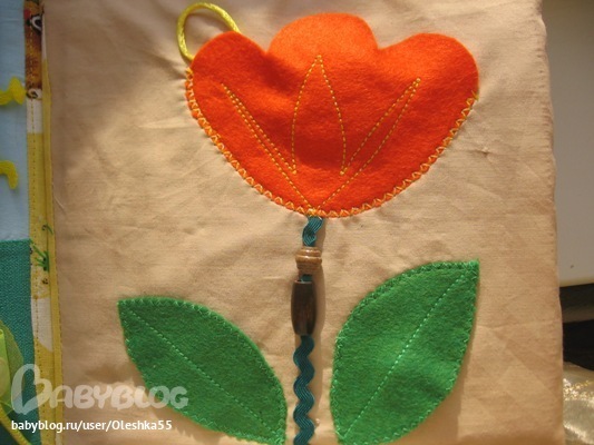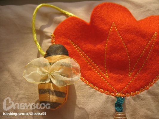 Цветок выполен из фетра, внутри цветка пчелка-шуршалка, под листочками - паучек и бож.коровка, по стебельку катаютя бусинка - дерево.