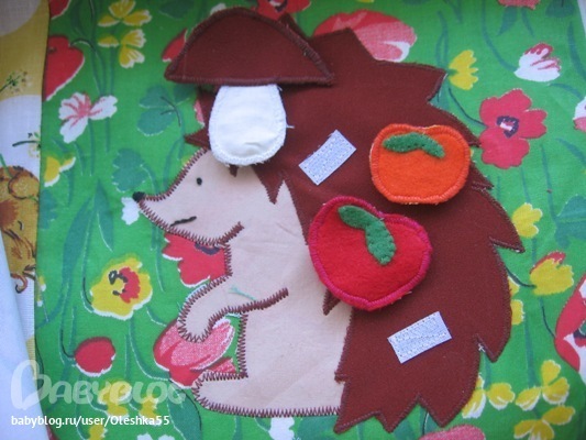 Капуста на огороде сделана из обтянутой пуговицы и сетки, морковь и свекла из фетра. Овощи на липучках их можно складывать в корзину.