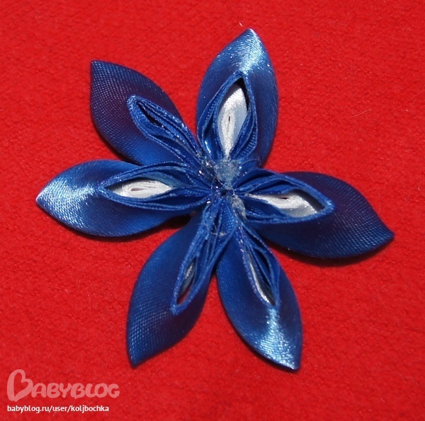 Лицевая сторона.Клеила клеевым пистолетом(он у меня толстый).Лепестки опаливала зажигалкой.Синяя лента - 5см,белая - 2,5см.Вопрос в том,как склеивать лепестки между собой,за самый кончик или как у меня?и надо больше лепестков делать,если узкие?как-то они растопырились не красиво.